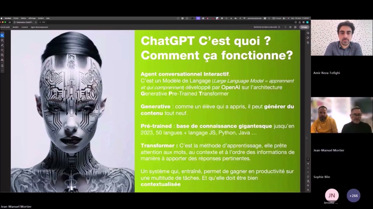 Le lancement du premier webinaire, animé par Amir Reza-Tofighi, Président de la Commission Innovation, a eu lieu mardi 19 mars et avait pour thème le potentiel conversationnel de ChatGPT.
